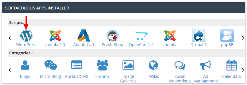 - Untuk menginstal Wordpress, kursor ke bab paling bawah hingga menemukan tab Softaculous Apps Installer. Pada bab Scripts klik Wordpress.